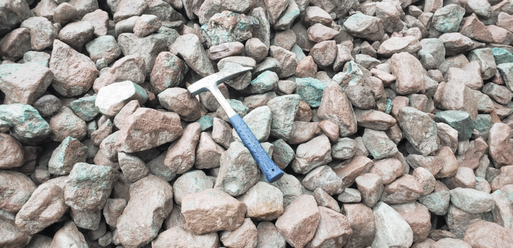 Sí, es un lugar atípico. Es un lugar donde hace calor, es diferente a otros proyectos. Esto es propio de la naturaleza del lugar. Los pórfidos tienen su origen en eventos volcánicos, tienen una naturaleza más árida, más desértica, están más cerca de la cordillera. Entonces tienen otros aspectos. Nuestro yacimiento es sedimentario, está más vinculado a aguas termales que impulsaron todo lo que es el cobre y lo depositaron. En nuestro proyecto puedes ver el cobre en la roca, y además nosotros seleccionamos por color el lugar donde vamos a trabajar. Nuestra forma de trabajar es mecánica, usamos excavadoras con martillos y seleccionamos, picamos, trituramos y seleccionamos por color el cobre que finalmente se embolsa y se manda a Chile, que es donde se termina procesando el cobre.