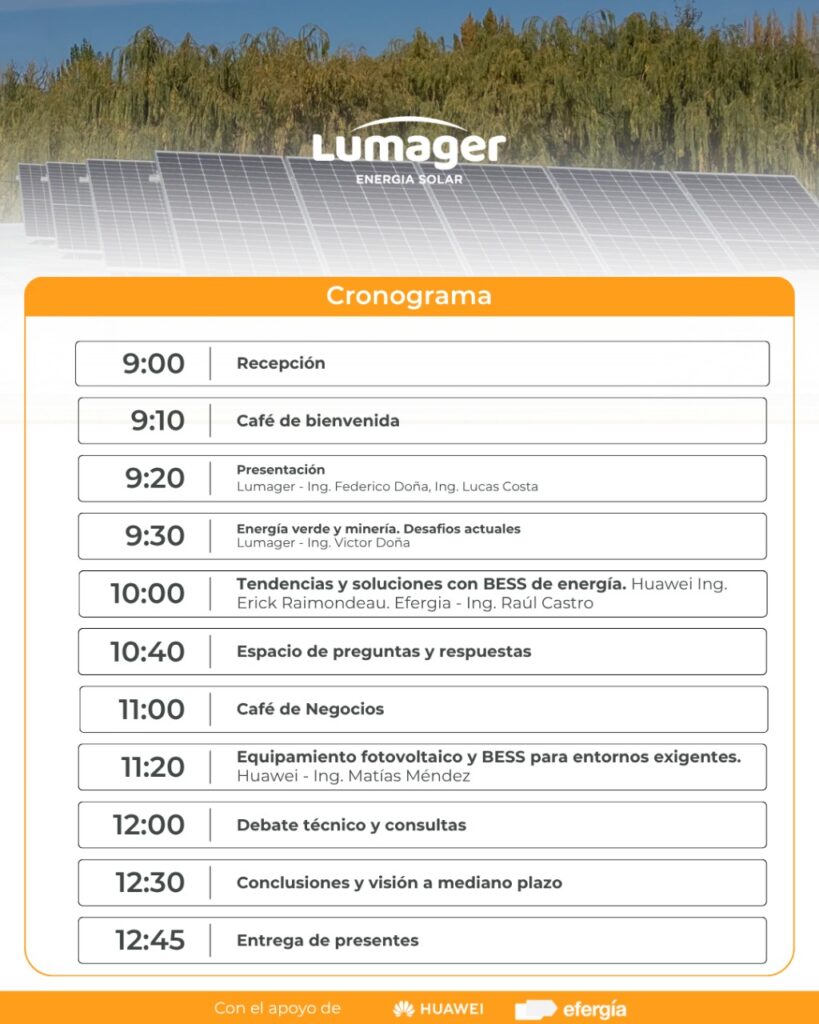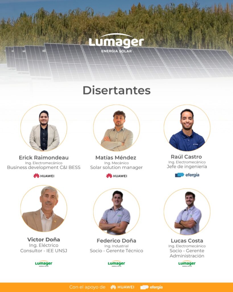 Exactamente, la idea es que sea toda una mañana de charlas, de experiencias y aprendizaje a través de Lumager y Huawei sobre lo que es la energía solar y todas sus particularidades. Lumager es una empresa a la que estoy asesorando y que tienen su mayor cantidad de instalaciones on-grid aquí en San Juan. Y también están trabajando para otras provincias del país también. En el evento también vamos a hablar de la complicada situación de la red eléctrica, la combinación de lo solar con el almacenamiento. Daremos conceptos sobre lo que significa el almacenamiento, sus costos en reducción y los nuevos lineamientos de cómo ahora se está viendo el almacenamiento como una cuestión que se puede parar por sí solo. Habrá charlas técnicas que van a ser más puntuales también, asique los esperamos a todos.