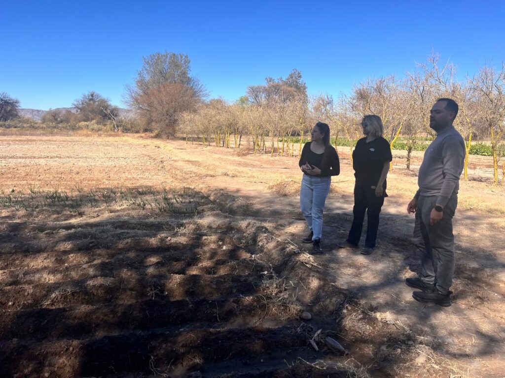 Enzo Bravo junto a personal de la empresa Caterwest realizando observación y estudios sobre los cultivos alternativos que se están desarrollando en Jáchal.